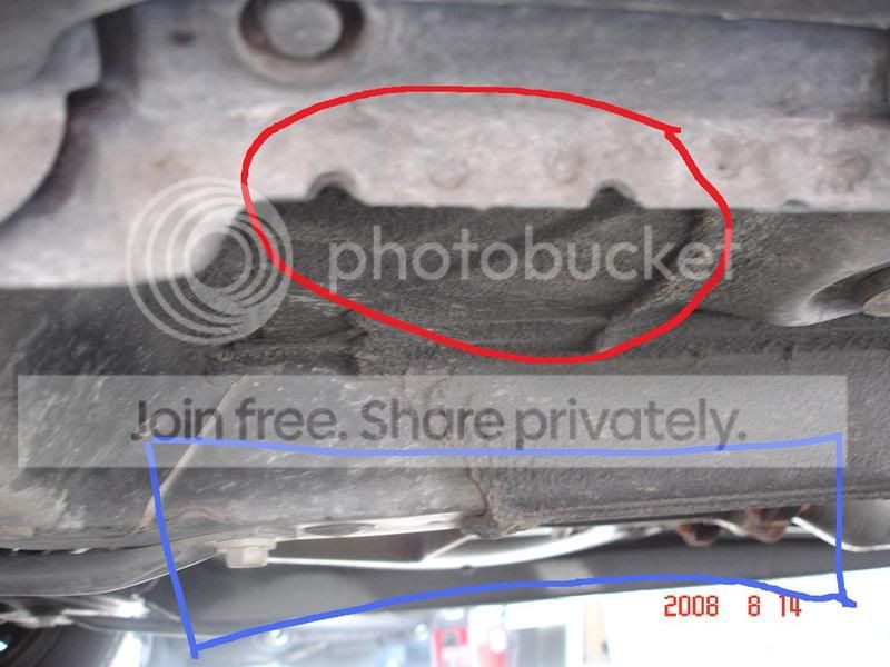 about jacking the car up... i don't see the arrows, but i see the groove slots (circled in red) where you normally use the scissor jack, besides that there's a (prob a 1.5" wide) bar (circled in blue) that runs parallel to the grooved slots. i'm thinkin that's where the jack stands will support, right?