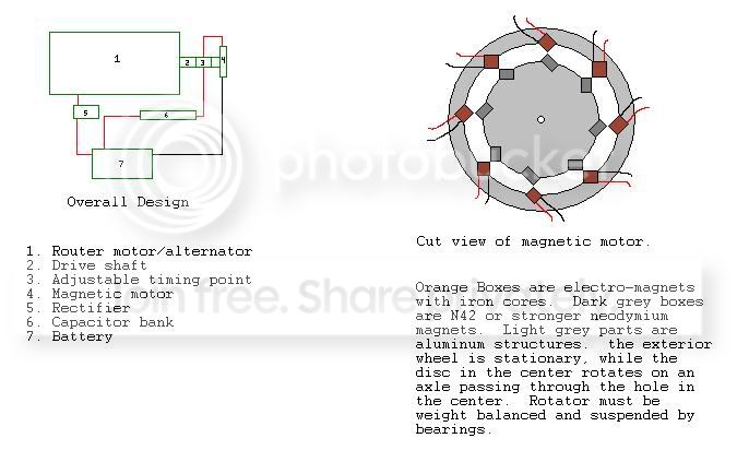 well, the whole point is to give it away. i don't want to patent it. i don't want it to be owned. i just want everyone to benefit from it. and the way it works is fairly simple... i drew up a simplified diagram with labels. with a little trial and error you could probably make my test model. it's not free energy, but energy turned from potential, to kinetic, to electrical. the system cycles back into itself, to sustain it, but requires less to sustain it than it produces.