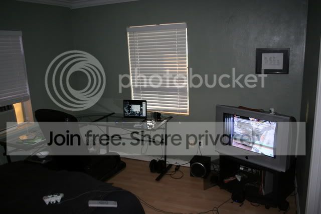 Space is limited in my bedroom but this is my current setup. 30" Samsung 1080i, xbox 360 connected with component, surround sound by logitech (sounds pretty good for 70bucks) Well, there you have it, my budget bedroom setup.
