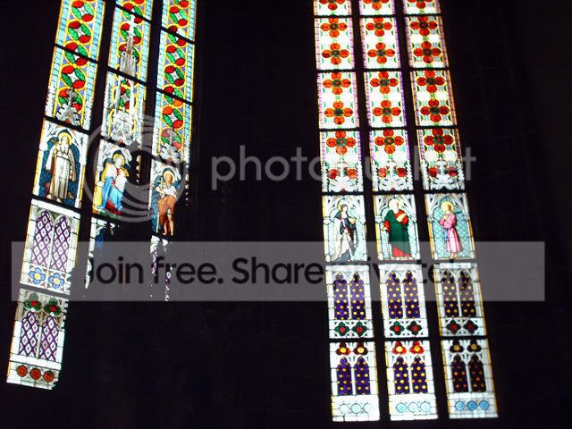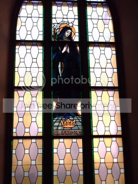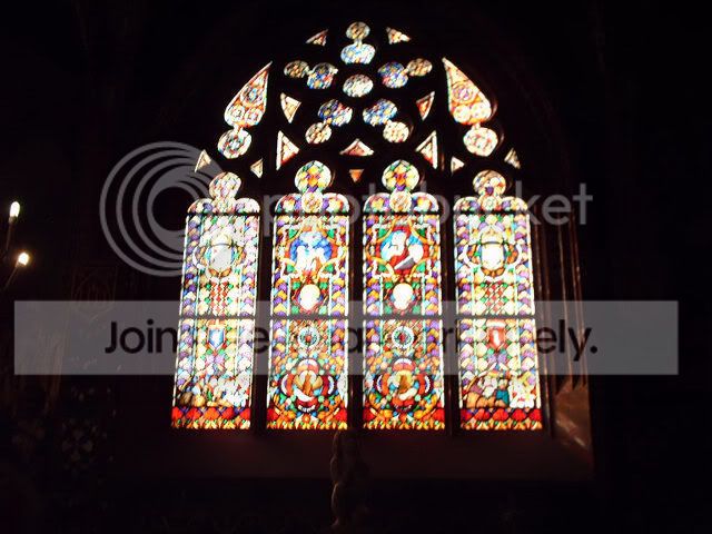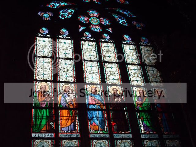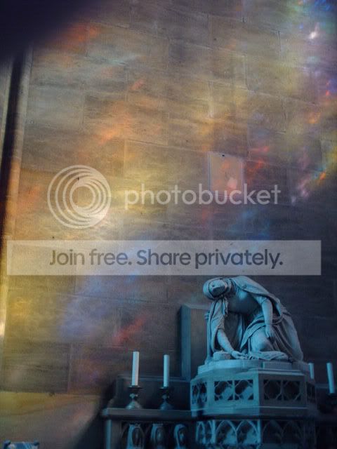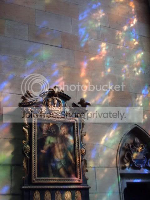 Notice the angle of the sun reflecting the colored glass on the walls: