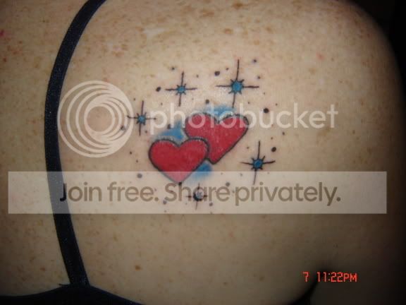this one my wife got done on her right shoulder. the hearts were a previous tattoo that they made look poopy, the guy that did ours today basically redid them and made it look a hell of a lot better. the two hearts represent our 2 kids and the five stars represent the 5 family members that we lost in february.