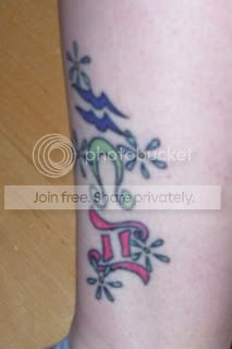 Here is one of my tattoos (the other 2 are small and not worth even posting). They are my children's symbols and done in their birth month jewel colors.