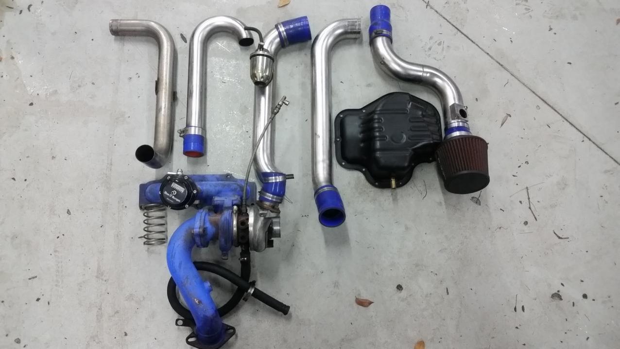 Kit is complete and functions properly, manifold has a small hair line crack, wastegate comes with 2 springs, 5psi and 10psi. engine management is not needed, but is always better to have. Kit was originally bought as a Zpi Stage 0 with intercooler.