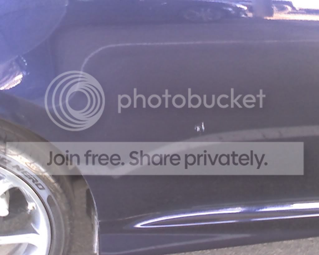 The second scratch is on the passenger door and is quite large - about the size of half-dollar. I think it was caused by road debris being kicked up by the tire. It's a bizarre sort of figure eight marking...