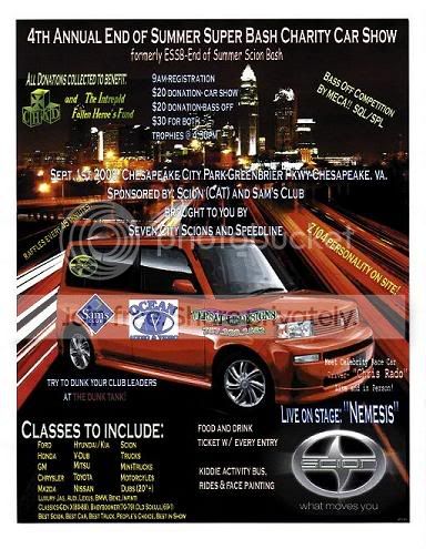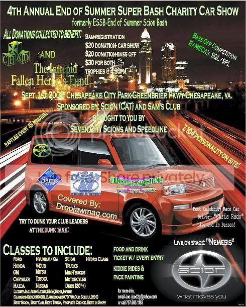 bump, dont forget to put your crew and names on the list- we only have about 2 weeks before the show!!!we will be having 2 carshows in our area- the CVC Vdot show on the 31st of August in Suffolk, Va and folling it on Monday- Labor Day- the 4th Annual End of Summer Super Bash- So come down, over and/or up from ya hood and enjoy both shows- If we have a big enough turnout for the Vdot show with Scions, they will have a Best Scion category too!