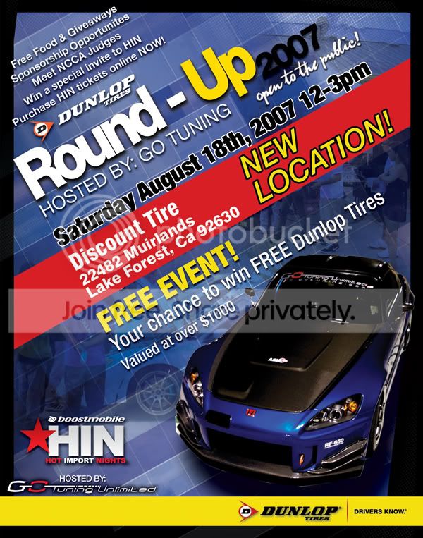 Go Tuning Unlimited will be hosting Dunlop Round-Up 2007 on Saturday, August 18th from 12-3pm. Come out for free food & giveaways and your chance to win a free set of tires!