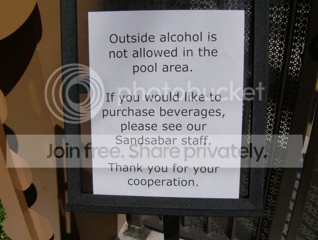 After we kept bringing our own Jack and vodka to the pool (and pestering the waitress for coke and Redbull) they then put up metal signs stating "no outside alcohol allowed in pool area"