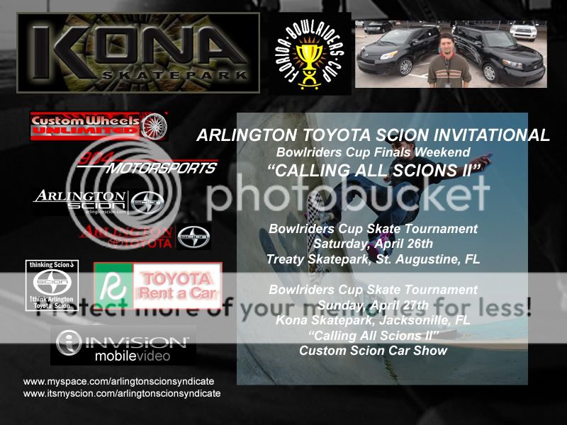 Hey evryone!!!! Introducing The Arlington Toyota Invitational Bowl Rider's Cup Skate tournament! April 26th and 27th. The April 26th show will be held at Treaty Skatepark in St. Augustine Florida. We will be the title Sponsor but will not have the car show there. But please don't miss it. It should be an awesome tournament. And then the finals will be held at Kona Skatepark here in Jacksonville, FL. We will have the "Calling All Scions II" Custom Scion Car Show on the park grounds. Get there early, as it will be PACKED! We are talking a bunch of people. Music, Food, Women, Moms, Dads, Kids, and lots and lots of Skating!!!