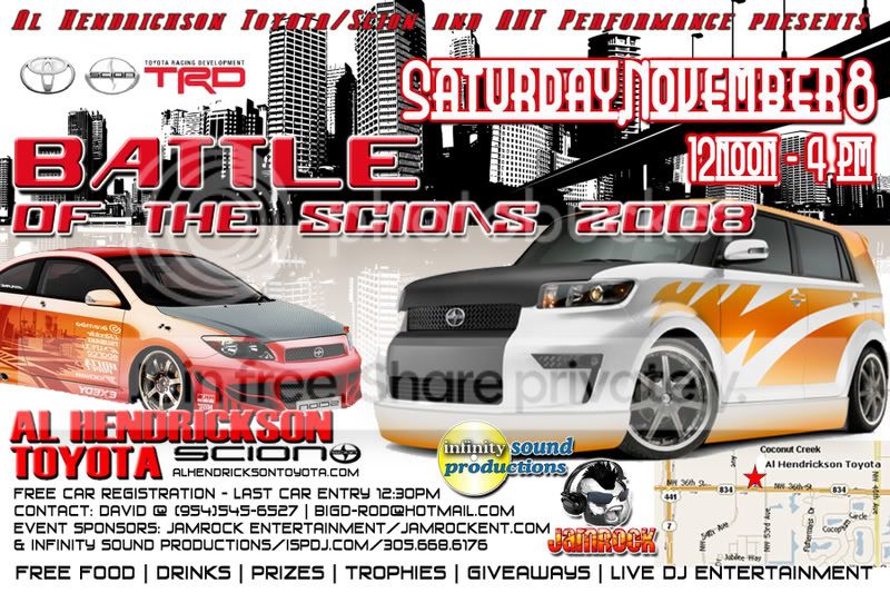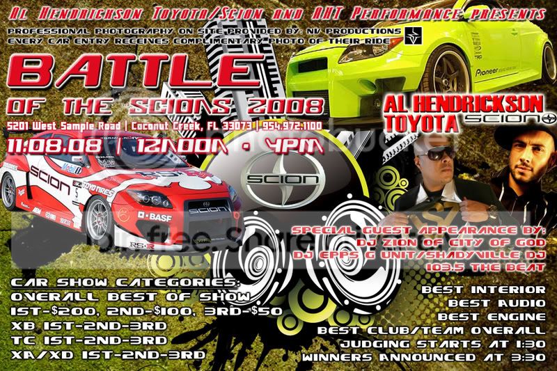 The flyer pretty much explains it all so come join us November 8, 2008 from 12pm-4pm at Al Hendrickson Toyota/Scion. Registration is FREE. There will be FREE Food, Drinks, Prizes, Trophies, Giveaways, and Live DJ Entertainment. Each show category recieves a Trophy and Overall Best of Show Cars recieve Cash prizes 1st-$200 2nd-$100 3rd-$50. Best Club/Team based on most amount of winners in club/team. All car entries will recieve a complimentary pic of their ride provided by NV Productions. Special guest/judge appearance by Dj Zion from City of God Band and judge/Host DJ Epps G-unit/Shadyville DJ and 103.5 The Beat. Email me @ BigD-Rod@Hotmail.com or Call @ 954-545-6527 for Car Registration Info and Registration Form. Since there is a Best Club/Team category I just want to make sure you guys know the category wasnt made to keep everyone apart and grilling each other but just to see which club/team is repping the SouthEast Area the most with their hooked up Scions. Lets see how many scions we can get out here. We have rides coming all the way from Tampa, Orlando, Ft. Pierce, and WPB areas so the more the better. If you have any Further Questions, my contact info is above. Thanks and see ya there guys!!
