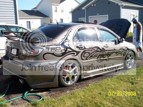 Yeah that's my boyfriends corolla...he's got tons of things done to it...lotta bling bling put into that car. LOL. Na but seriously I'm really looking into getting a tC. I wanna turbocharge it in the end. maybe around 300 whp. Of course I won't be going that fast with the kids in the car but, u kno sometimes i'll have the need for speed. LOL. I also want the car to look nice too...what things should i start doing first internally? And should I wait on putting the body kit on before or after?