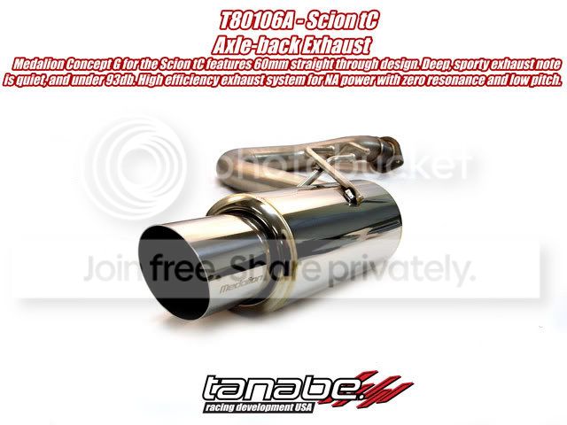 The Tanabe Medalion Concept G exhaust system for the 2005+ Scion TC has been on back order for the past 3 months and we are finally getting another container in early next week with the more of these systems. Consumers have showed alot of interest in the product and our dealers have been calling us for updates on the shipment so I'd just like to get the word out that these will be in stock shortly. Below are some pictures for reference. I will keep you guys updated on its arrival and if you guys have any technical questions about the exhaust system or any of our other products please let me know!