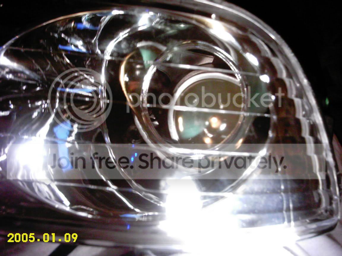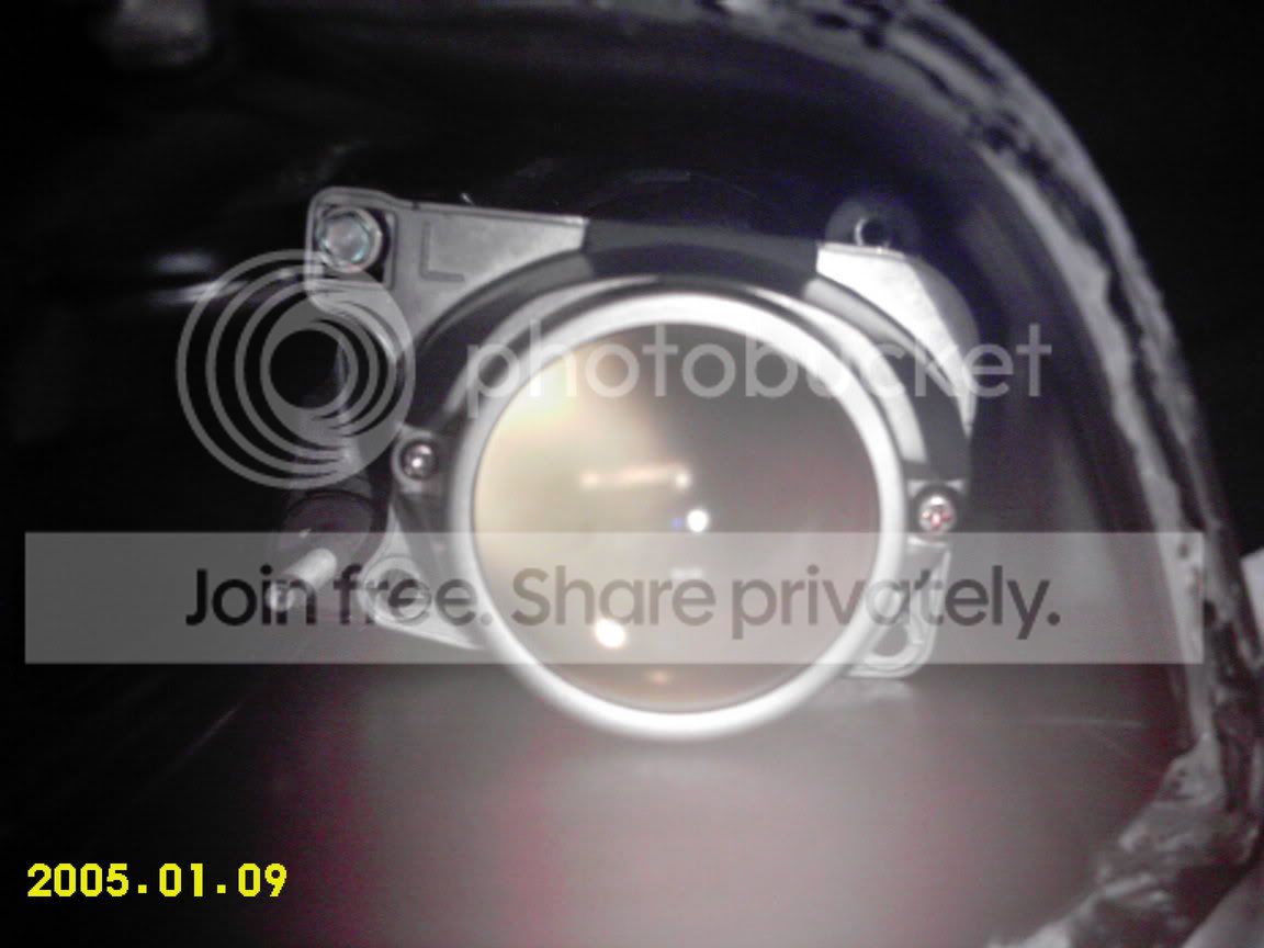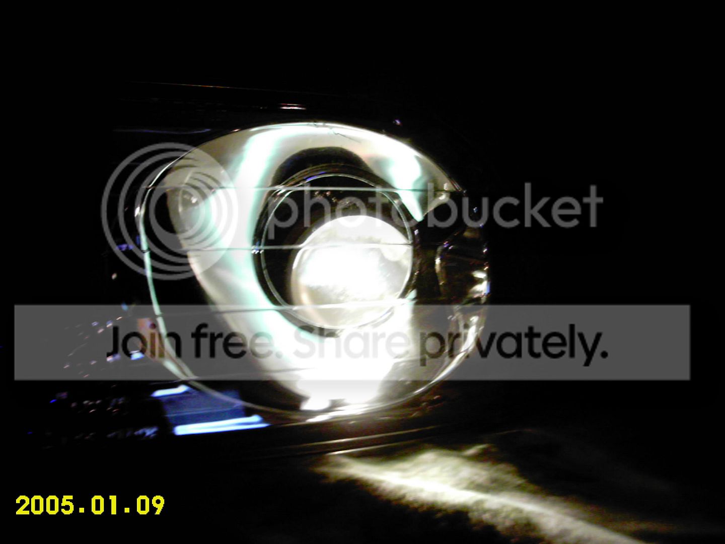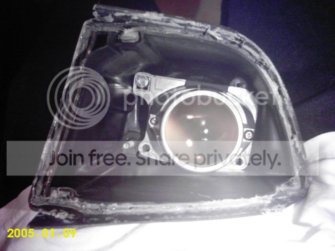 It gets worse, you will need to angle the the projector so it lines up correctly. The results are pretty good, BUT you cant take out the socket without taking apart the housing. So I advise making sure the bulbs are in good condition and that they wont go out on you any time soon. Also, since you removed the rubber gasket, you will leave a large opening for things to get inside the housing. You might want to cover up with something. Here's a pic of the the angled projector and its results.