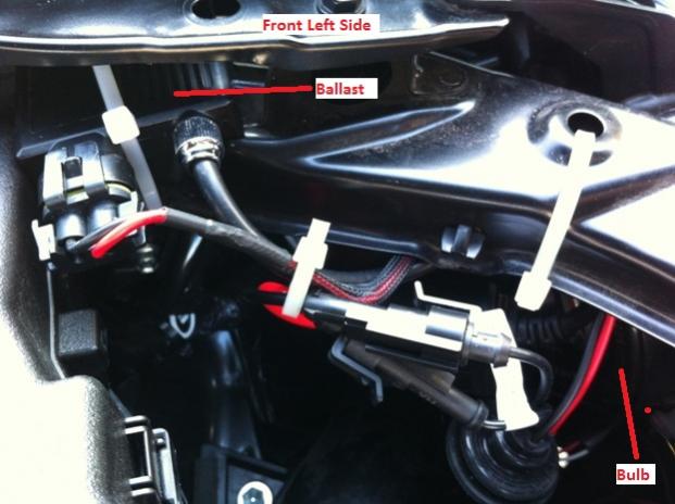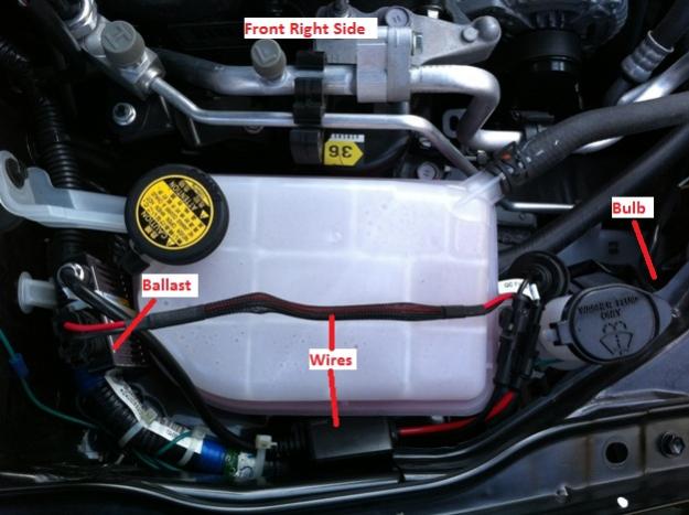 The bulb is hidden from the pic but right in front of the windshield washer fluid. The ballast and one side of wires are secured to the huge black cable. One wires could not be secured because it wasn't long enough to pass around the side of the reservoir