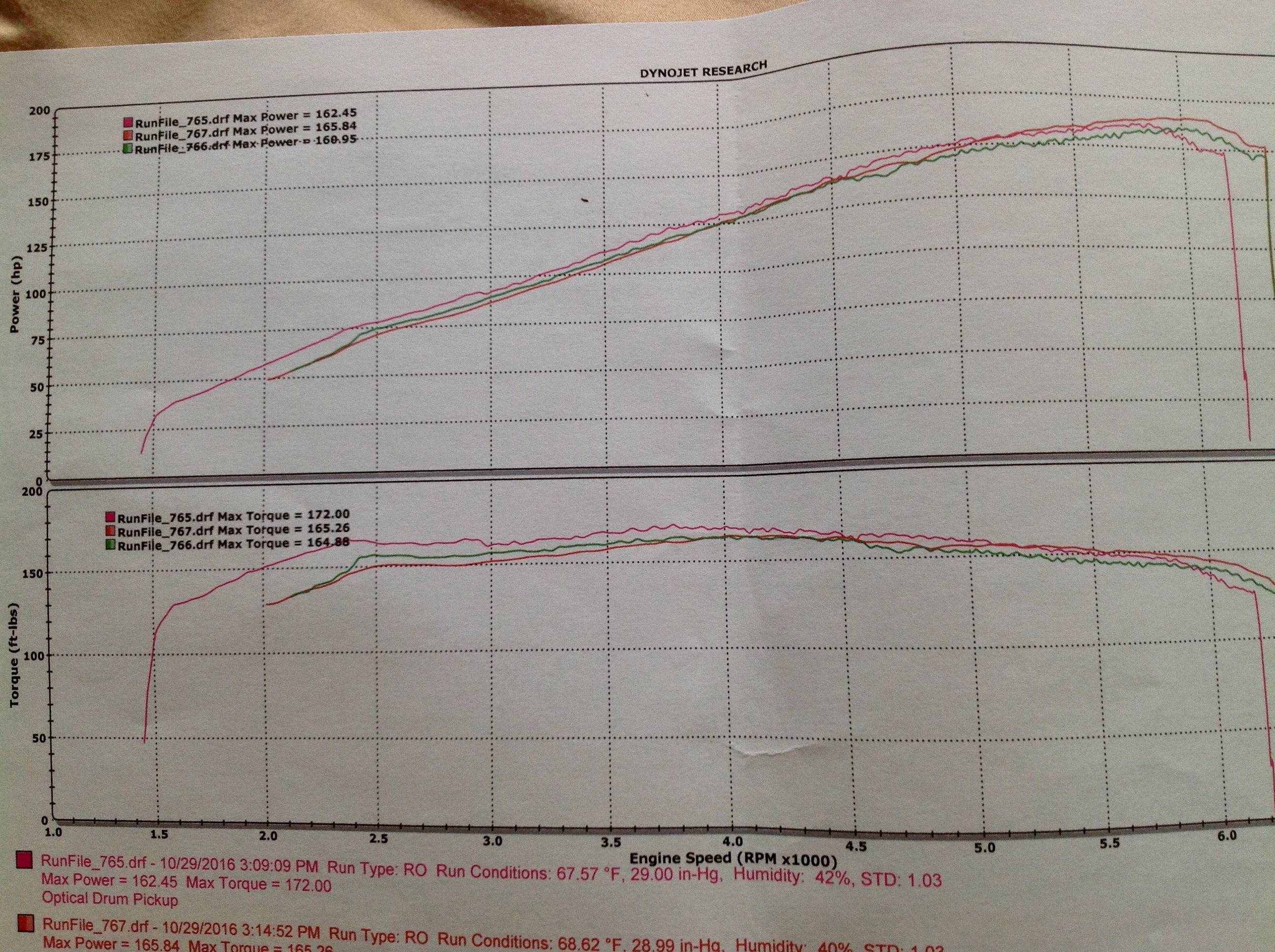 Hey guys n gals! New member here and wanted to share this with you! Got bored after work yesterday so decided to visit my brother in law who happens to have a dyno! Currently have a 2014 tC 6 speed with stock engine, intake, & exhaust and wanted to see what it would do for HP & TQ before I install a Dezod header & AEM intake! Was actually quite surprised with the numbers! We did 3 fourth gear pulls! First pull we used wheel speed only & got 162.45hp and 172.00tq! Next we used engine speed by hooking up to a coil and got 160.95hp and 164.88tq! And lastly we used both engine speed & wheel speed & got 165.84hp and 165.26tq! I'm very pleased with the results for a stock car! Maybe I got a "good one"?!