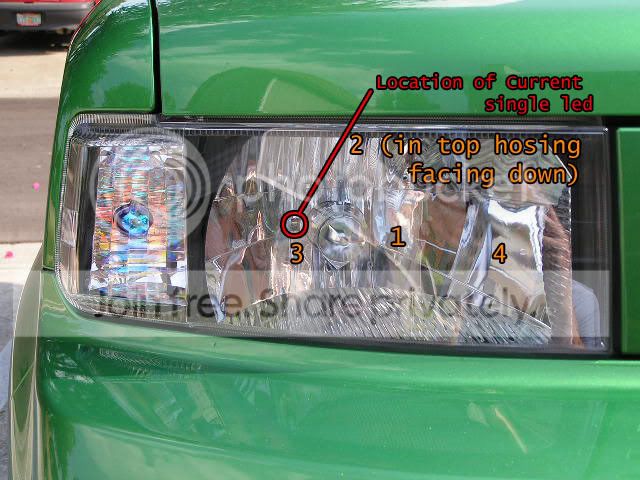 sounds good, do you think that if i drill at position 2 that the light will get a good reflection? i want to only drill once so i would like to be pretty sure about it all before i commit. as of now i have a single blue led in the little opening beside the headlight and its pointed inside the reflector and it works pretty well. how would i do this if its mounted at the top. Thanks!